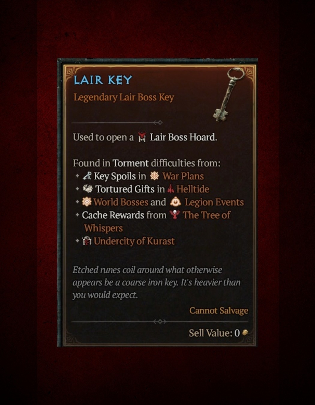 A Lair Key normal é utilizada para abrir os baús dos bosses de tiers mais baixos, (Grigoire, Varshan, Lord Zir, Fera do Gelo, Urivar). Esses baús sempre dropam itens que pertencem à pool específica daquele boss, ou seja, cada chefe tem seus próprios itens exclusivos que podem ser obtidos ali. Um ponto importante é que a chave não muda de acordo com o boss — desde que seja do mesmo tier, a Lair Key utilizada será a mesma, independentemente de qual chefe você enfrentar.